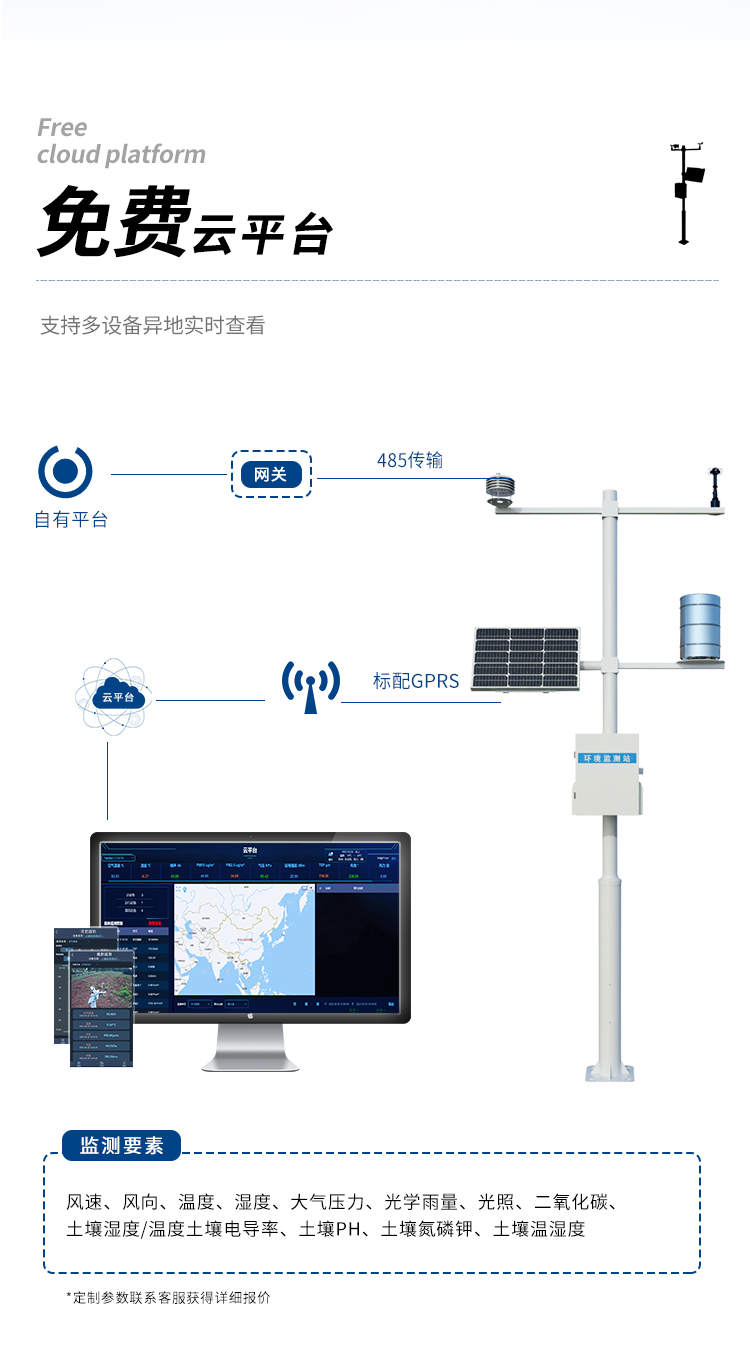 该设备由气象传感器,采集器,太阳能供电系统,立杆支架,云平台五部分组成。免调试,可快速布置,广泛运用于气象、农业、林业、环保、海洋、机场、港口、科学考察、校园教育等领域。