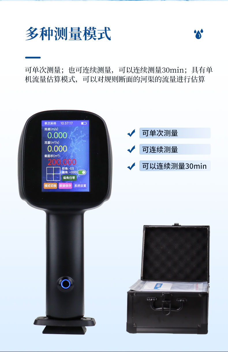 7.多种测量模式,可单次测量;也可连续测量,可以连续测量30min;具有单机流量估算模式,可以对规则断面的河渠的流量进行估算;