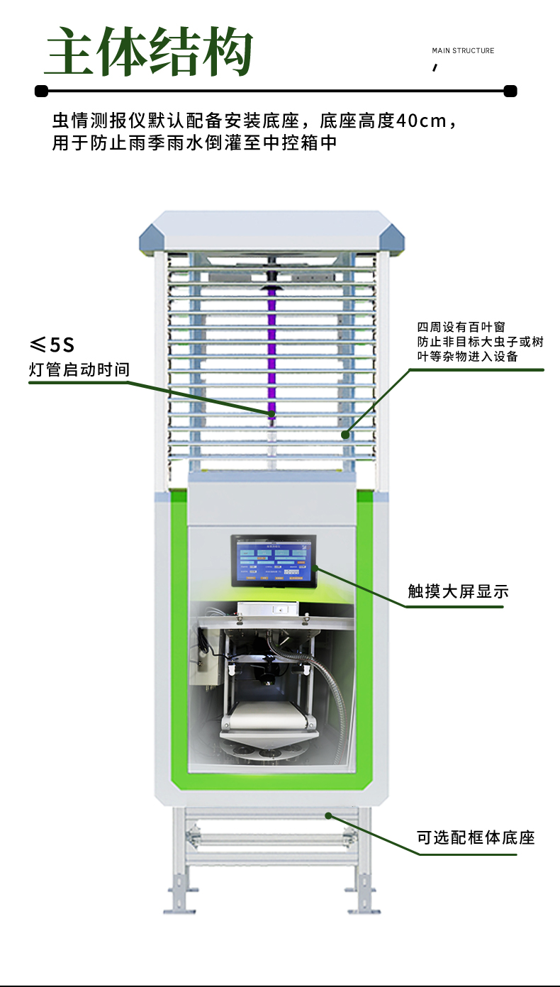 组成部分:诱虫装置、撞击屏、杀虫装置、高清摄像头、主控系统、机械组件、雨雪传感器、光感传感器、专业金属箱体框架